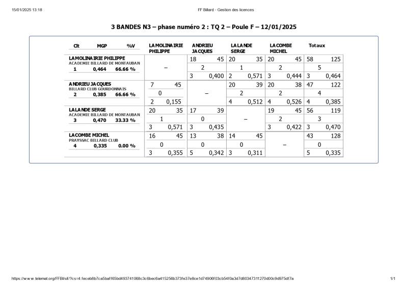 Ce dimanche a eu lieu la compétition Cadre R1 au club. Dans la poule A, Patrick Labourgade et Gilles Maigne terminent premiers à égalité, chacun affichant une moyenne de 2,60.